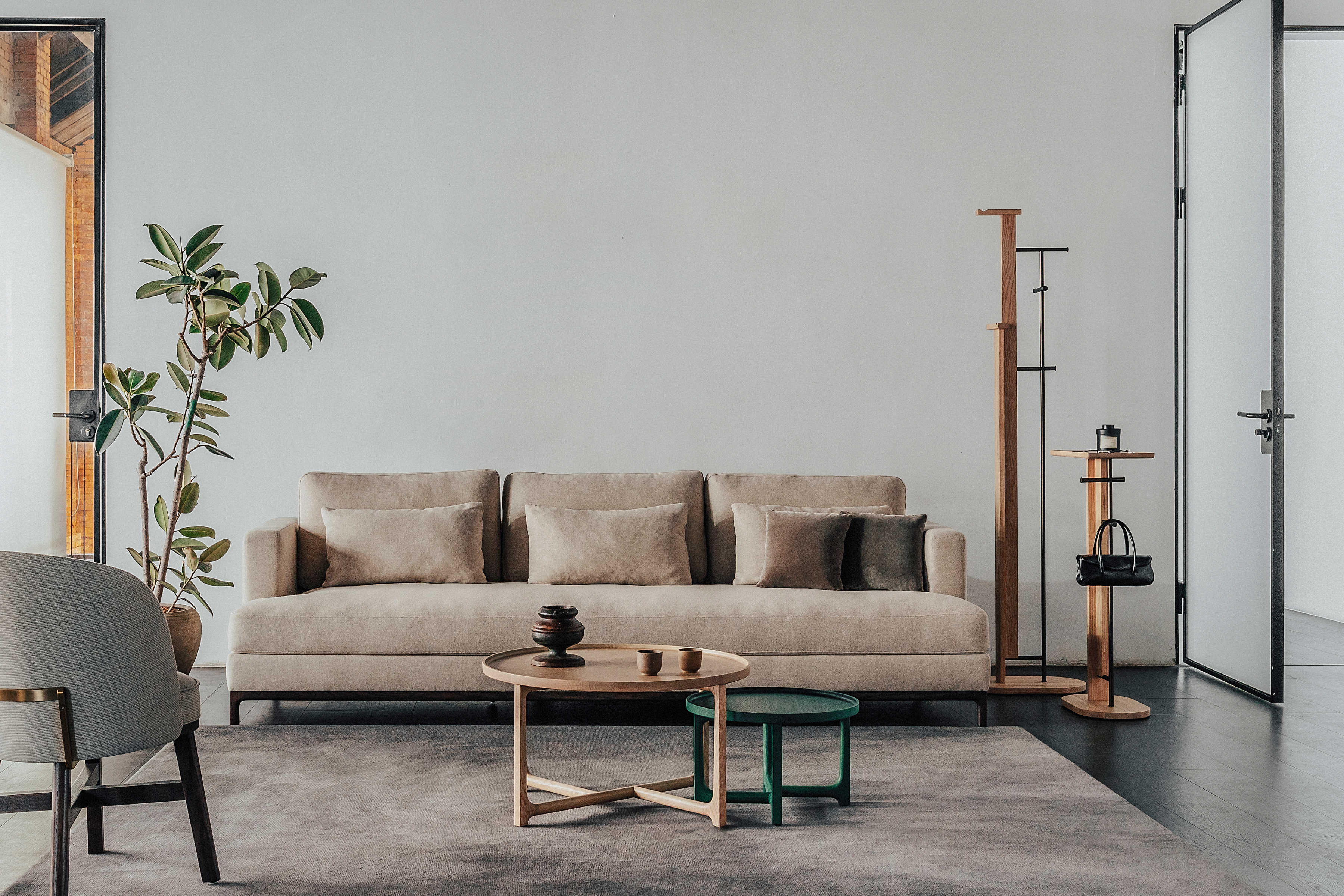 The collection comprises one, two, and three-seater sofas in wood with textile upholstery, suitable for diverse living spaces. Qi seamlessly infuses a subtle Asian aesthetic into contemporary contexts.
