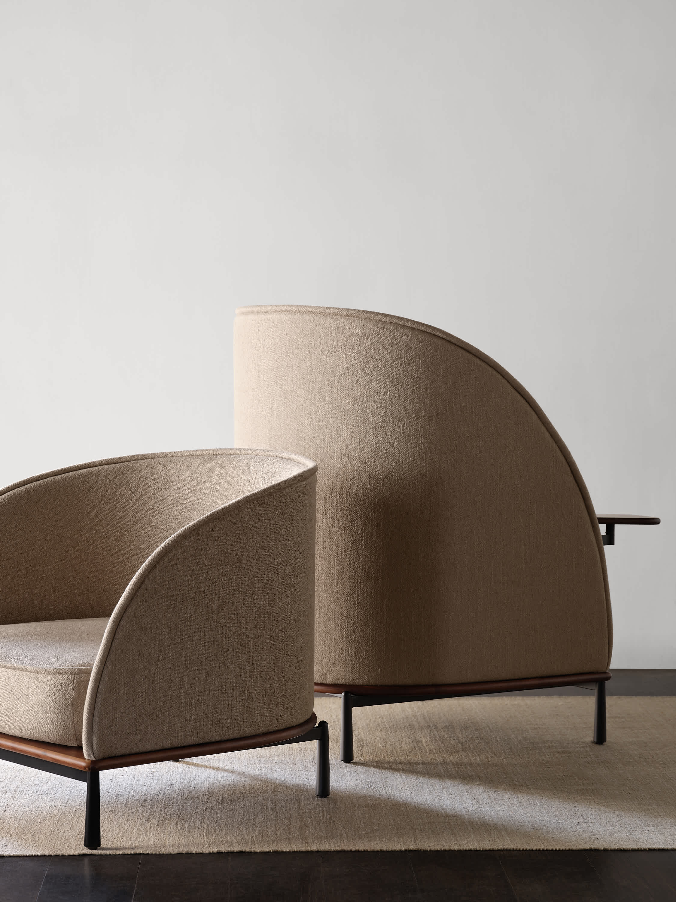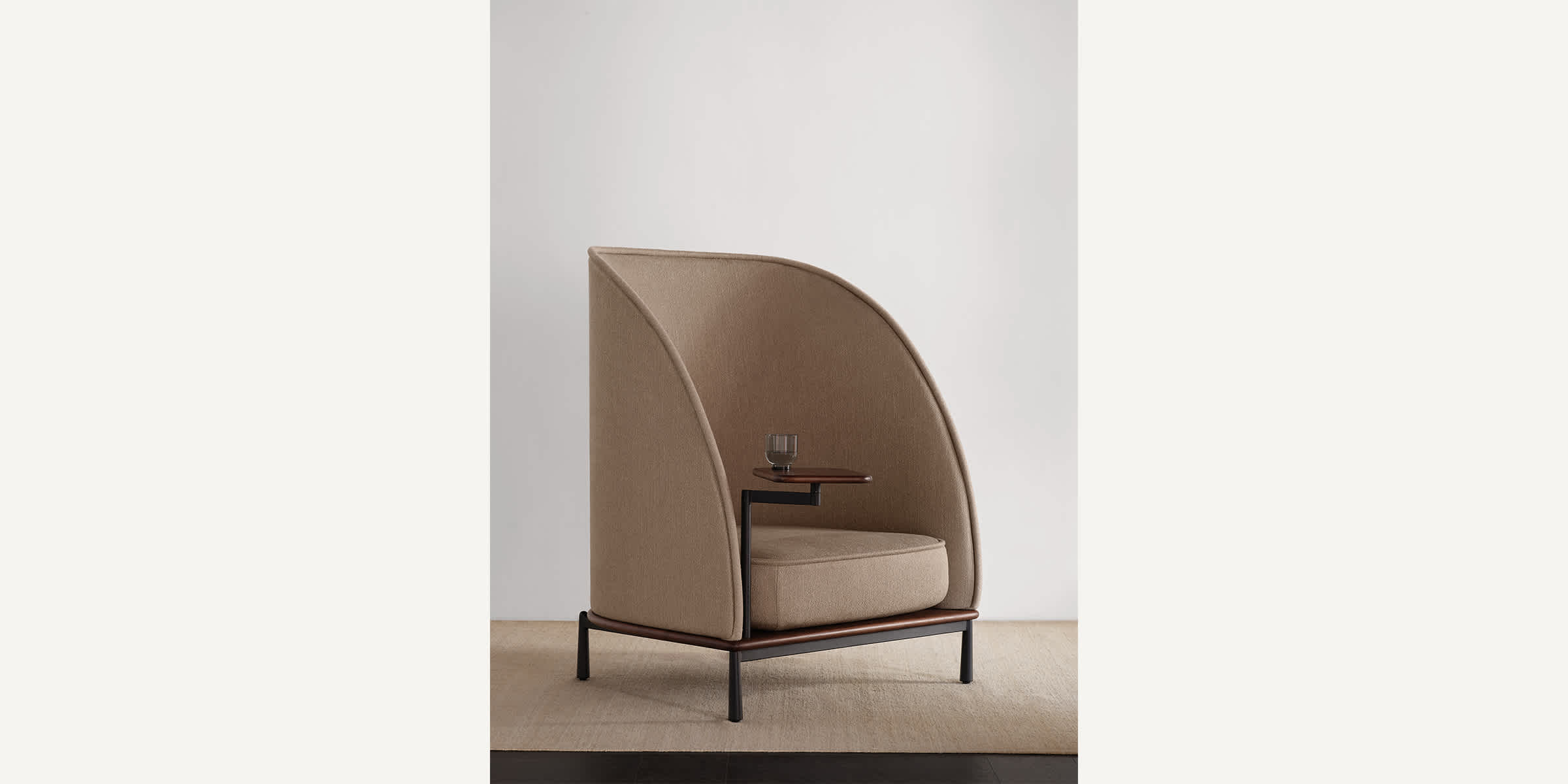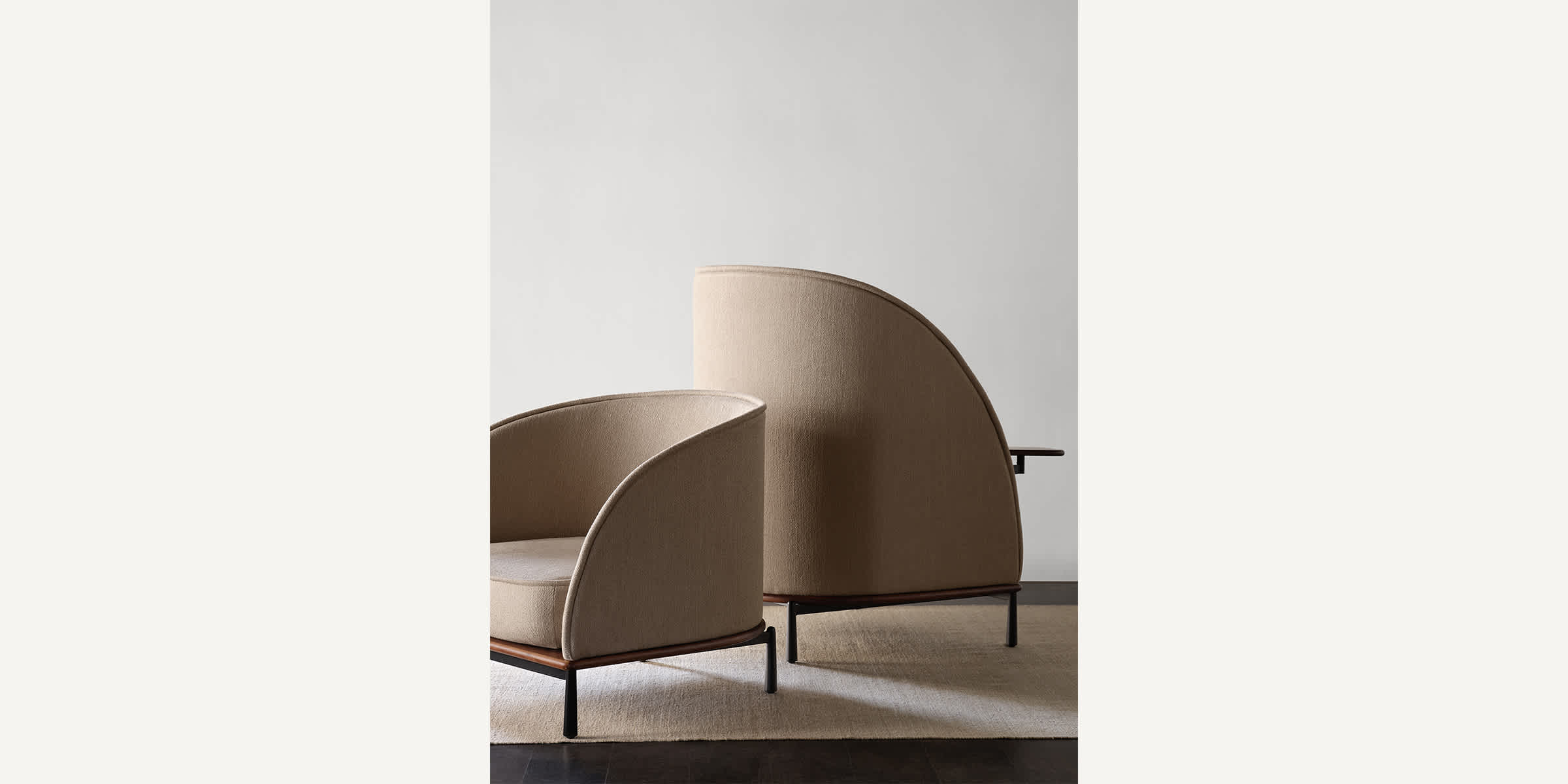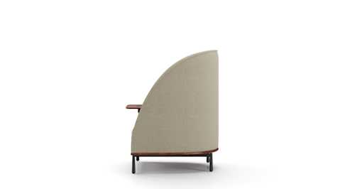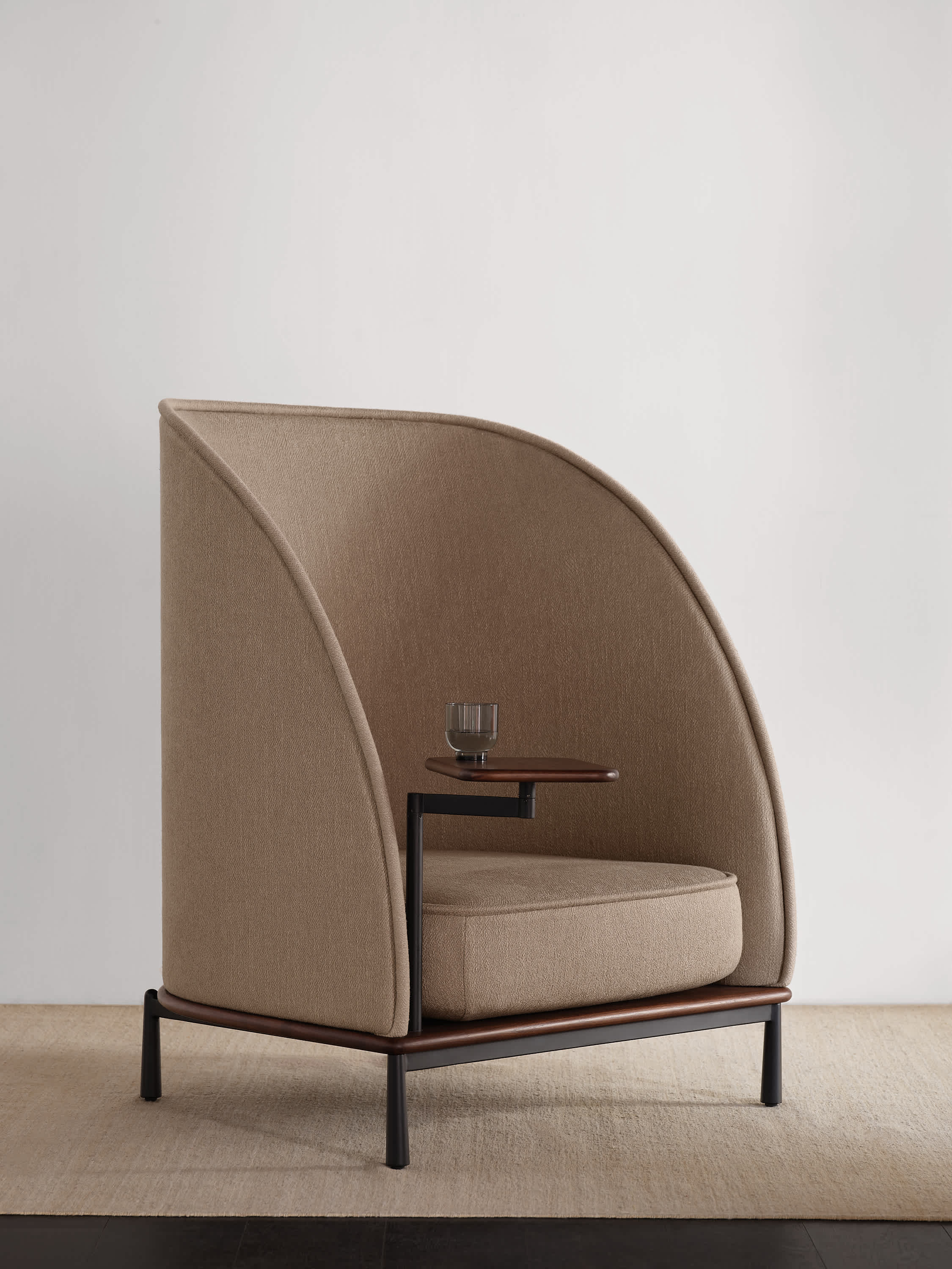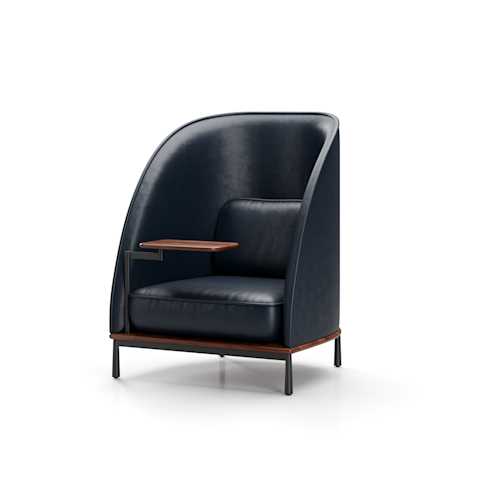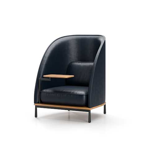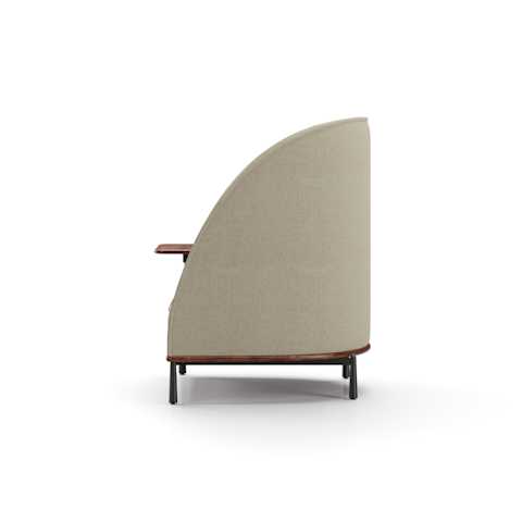 The Arc collection is designed to meet the demands of modern workspaces, providing a sense of shelter that evokes the comfort of home. Its distinct character sets it apart from conventional contract furniture, with a soft silhouette that enhances its recognizable identity. A thick seam defines the edge, creating a contrast between the rigid exterior and the inviting, sculpted interior.