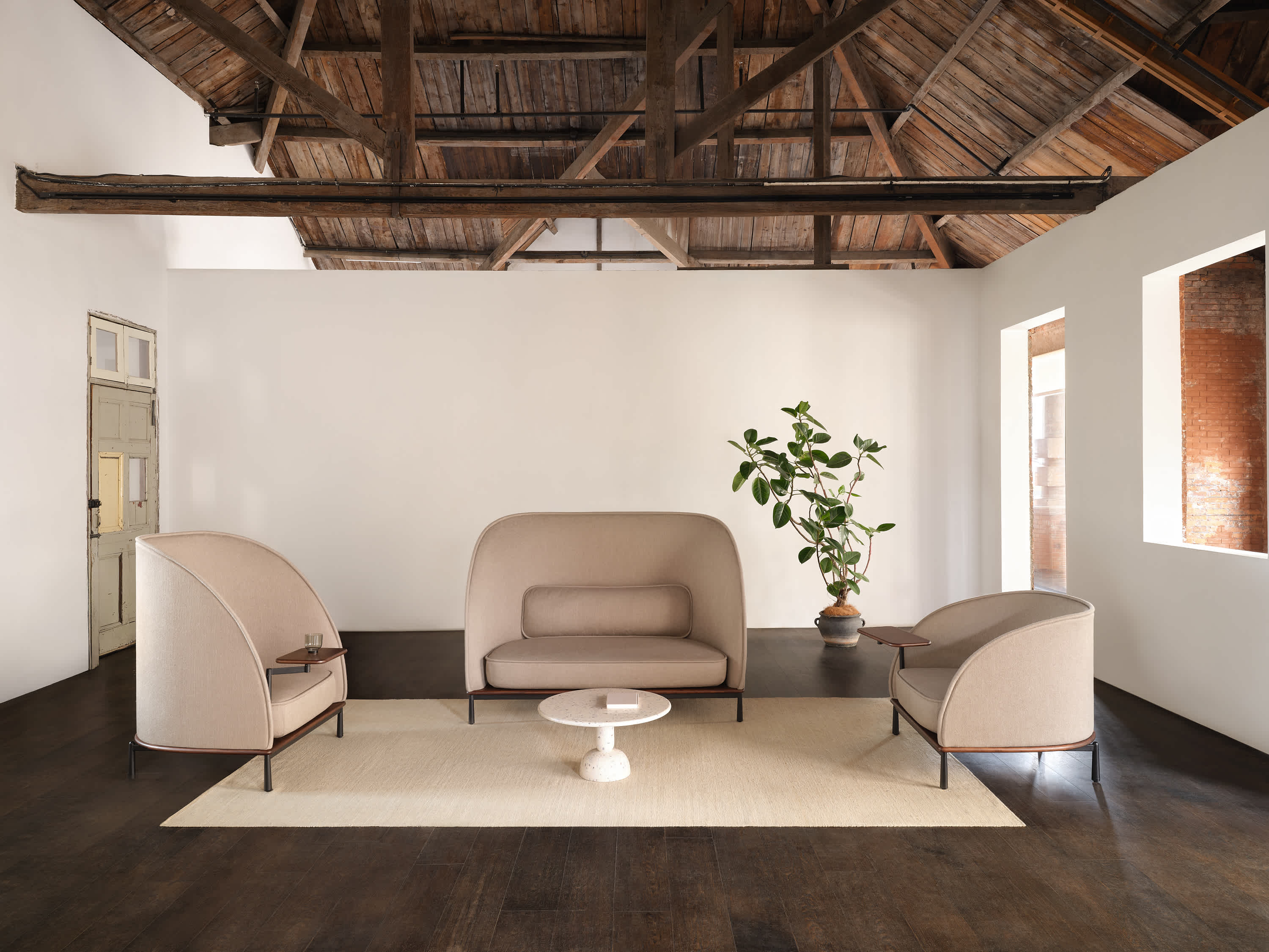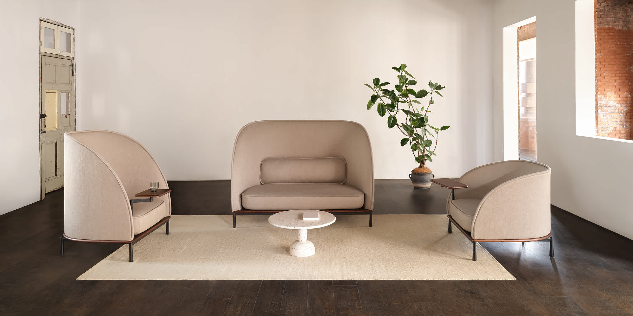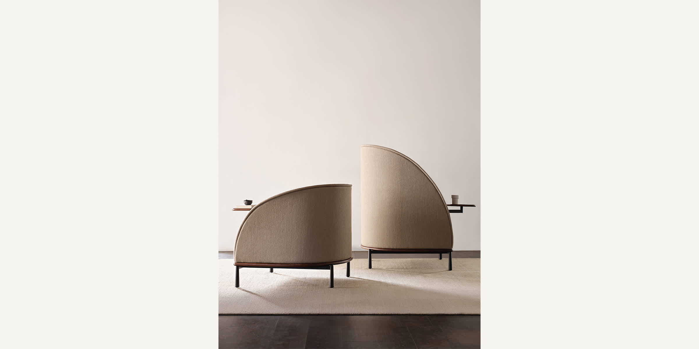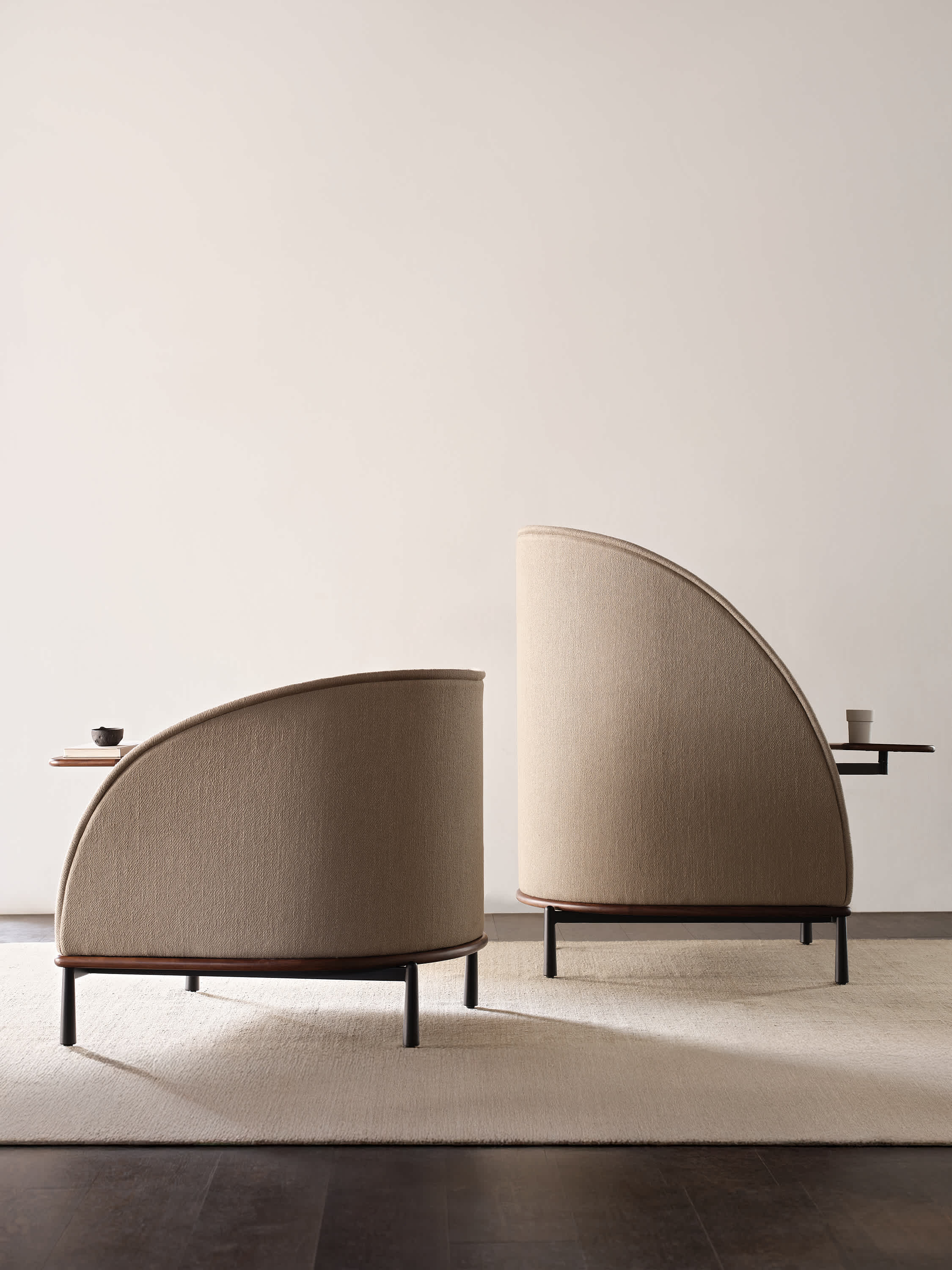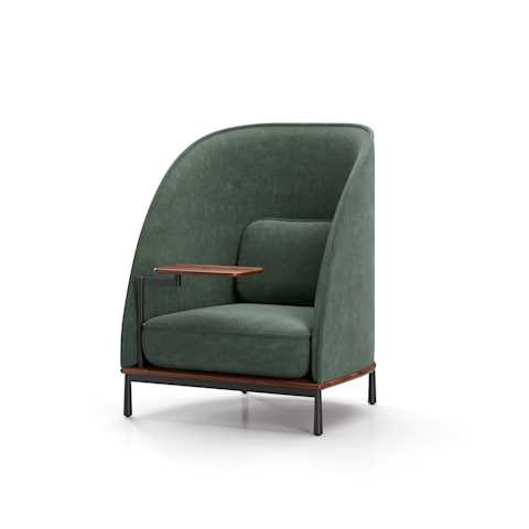 The Arc collection is designed to meet the demands of modern workspaces, providing a sense of shelter that evokes the comfort of home. Its distinct character sets it apart from conventional contract furniture, with a soft silhouette that enhances its recognizable identity. A thick seam defines the edge, creating a contrast between the rigid exterior and the inviting, sculpted interior.